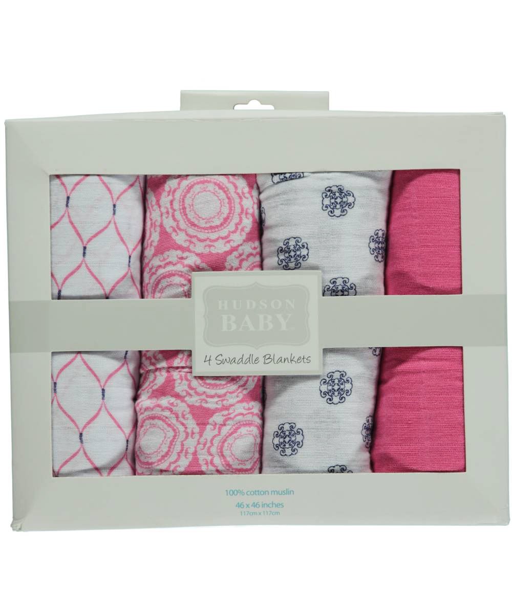 Hudson Baby 4-Pack Swaddle Blankets - pink, one size is best for youSize:one size | Color:Pink These pre-washed, super soft muslin swaddle blankets from Hudson Baby are generously sized to make swaddling a breeze. 100% Cotton Machine Wash Cold Imported