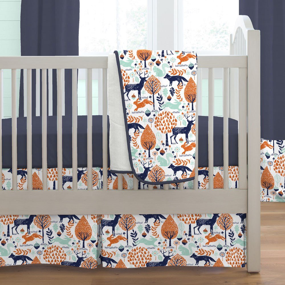 Carousel Designs Navy and Orange Woodland 3-Piece Crib Bedding Set is best for youOur 3-piece set in the Navy and Orange Woodland Crib Bedding collection includes a Navy and Orange Woodland Crib Comforter, Solid Navy Crib Sheet, and a Navy and Orange Woodland Animals Crib Skirt Box Pleat 14-Inch Length.